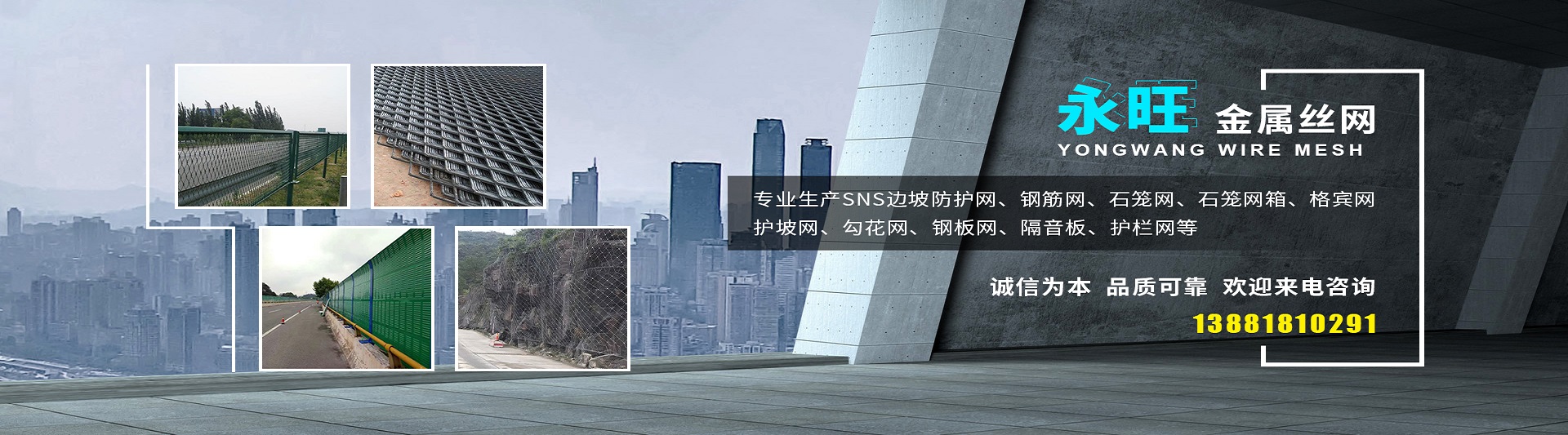 服務(wù)熱線: 成都市永旺金屬絲網(wǎng)有限公司是一家研發(fā)、生產(chǎn)、加工、銷售為一體的責(zé)任制企業(yè)公司。本公司“以誠信為本、以服務(wù)社會已任、以科學(xué)創(chuàng)新為理念”。 專業(yè)生產(chǎn)SNS邊坡防護(hù)網(wǎng)、鋼筋網(wǎng)、石籠網(wǎng)、石籠網(wǎng)箱、格賓網(wǎng)、護(hù)坡網(wǎng)、勾花網(wǎng)、鋼板網(wǎng)、隔音板、護(hù)欄網(wǎng)等。產(chǎn)品主要運(yùn)用于鐵路,高速公路,橋梁,隧道,機(jī)場,礦山,河道,球場,碼頭,港口等多個(gè)領(lǐng)域。 本公司期待與您長期合作,希望與您共創(chuàng)輝煌,我們愿與各業(yè)朋友精誠合作,共創(chuàng)美好未來,希望各業(yè)朋友來函來電